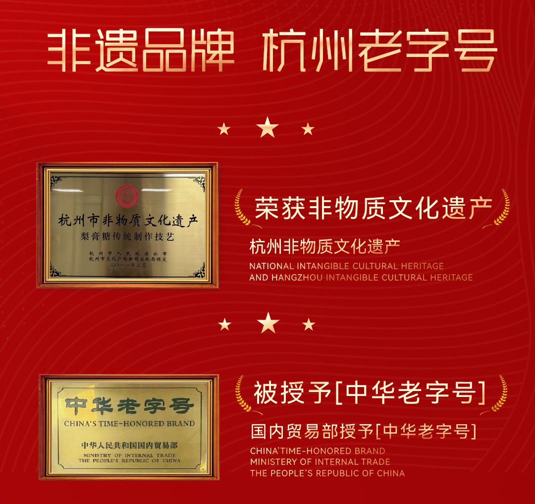 小热昏发财梨膏糖,源自江浙沪非遗曲艺“小热昏”与百年梨膏糖技艺的融合。其以纯梨汁、罗汉果、金银花、茯苓等十余味中草药古法熬制,兼具润肺止咳与清咽利喉之效。作为国家级非遗“杭州小热昏”,产品传承“三分卖糖,七分卖唱”的市井智慧,其名“发财”既蕴含传统商贩祈福纳祥的市井文化,亦象征健康财富双收的现代寓意,是品味非遗、润养身心的江南伴手礼。
